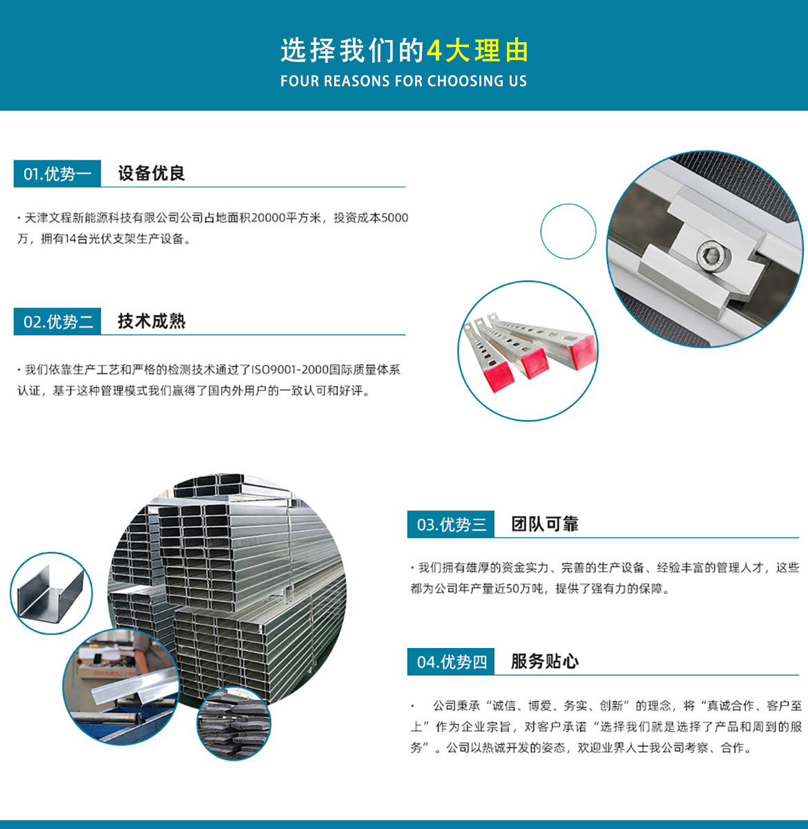 天津文程新能源科技有限公司成立于2021年,是專注于集中式、分布式、漁光互補(bǔ)和農(nóng)光互補(bǔ)等清潔能源發(fā)電的綜合性企業(yè) 公司是集設(shè)計(jì)、研發(fā)、生產(chǎn)、制造為一體的綜合型企業(yè)。公司占地面積20000平方米,注冊(cè)資金5000萬元整。公司坐落于華北鋼鐵重鎮(zhèn)--大邱莊,距天津市區(qū)50公里、鄰104和205國道及京滬高速,交通十分便捷。 本公司擁有三個(gè)生產(chǎn)車間,其中兩個(gè)冷彎型鋼車間,一個(gè)鋅鋁鎂型鋼車間,擁有自動(dòng)冷彎成型機(jī)10條,自動(dòng)數(shù)控沖孔機(jī)10條以及焊接加工等設(shè)備。主要生產(chǎn)產(chǎn)品有:太陽能光伏支架、各種規(guī)格的C/Z/U型鋼、抗震支架、管廊支架及整套配件等。
