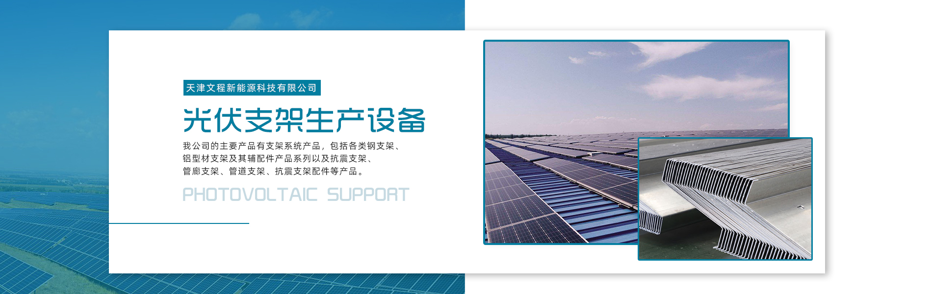 天津文程新能源科技有限公司成立于2021年,是專注于集中式、分布式、漁光互補(bǔ)和農(nóng)光互補(bǔ)等清潔能源發(fā)電的綜合性企業(yè) 公司是集設(shè)計(jì)、研發(fā)、生產(chǎn)、制造為一體的綜合型企業(yè)。公司占地面積20000平方米,注冊(cè)資金5000萬元整。公司坐落于華北鋼鐵重鎮(zhèn)--大邱莊,距天津市區(qū)50公里、鄰104和205國道及京滬高速,交通十分便捷。 本公司擁有三個(gè)生產(chǎn)車間,其中兩個(gè)冷彎型鋼車間,一個(gè)鋅鋁鎂型鋼車間,擁有自動(dòng)冷彎成型機(jī)10條,自動(dòng)數(shù)控沖孔機(jī)10條以及焊接加工等設(shè)備。主要生產(chǎn)產(chǎn)品有:太陽能光伏支架、各種規(guī)格的C/Z/U型鋼、抗震支架、管廊支架及整套配件等。